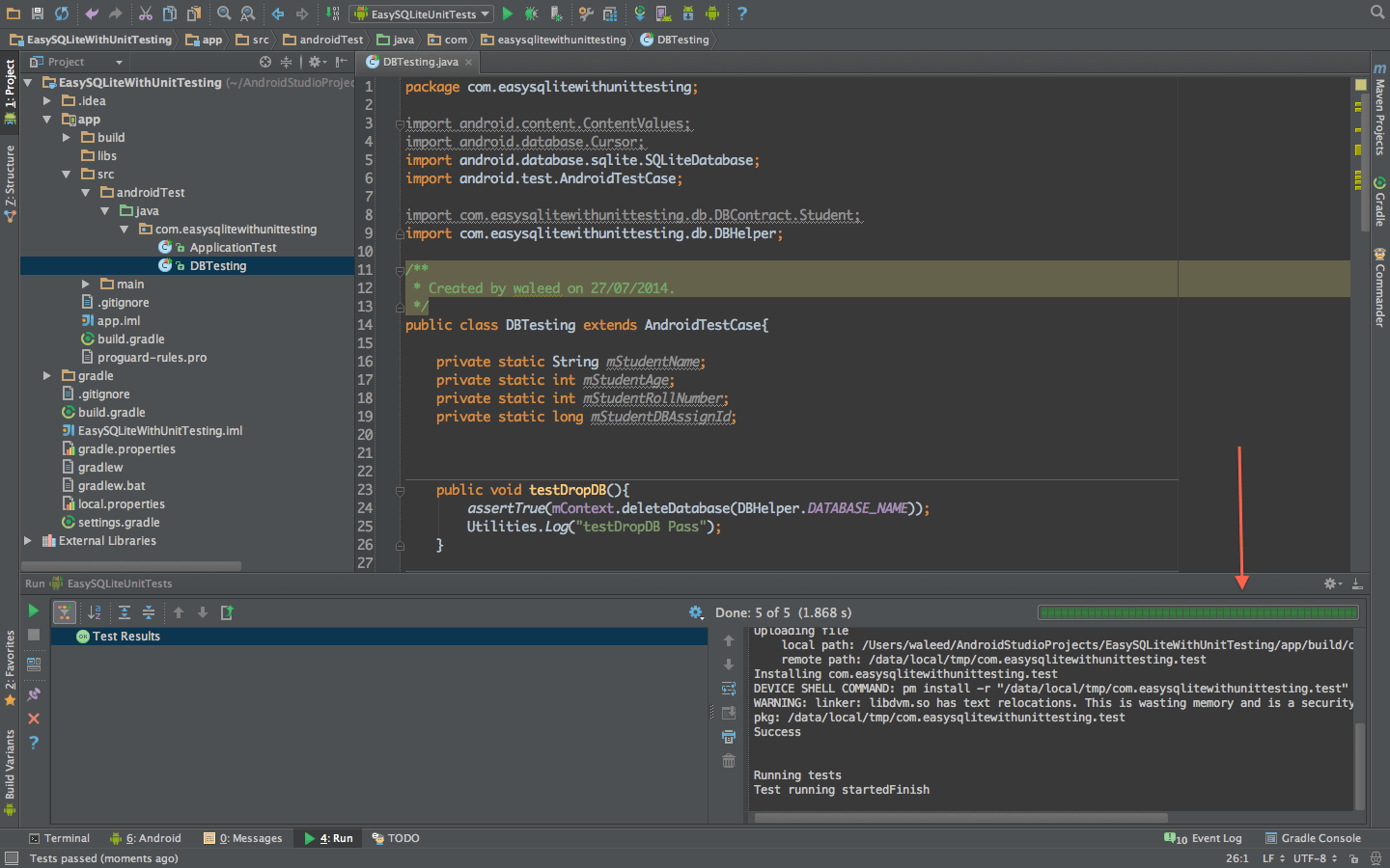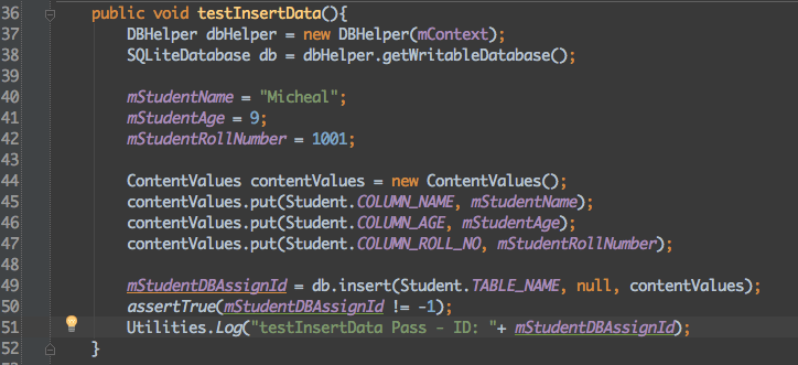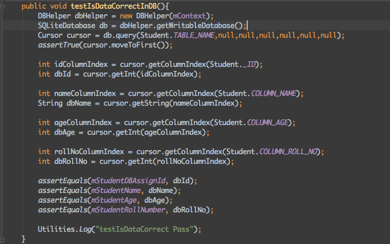 Now second method is testCreateDB if that pass its mean our DB creation is working properly. OK now one more small thing how we run our tests.