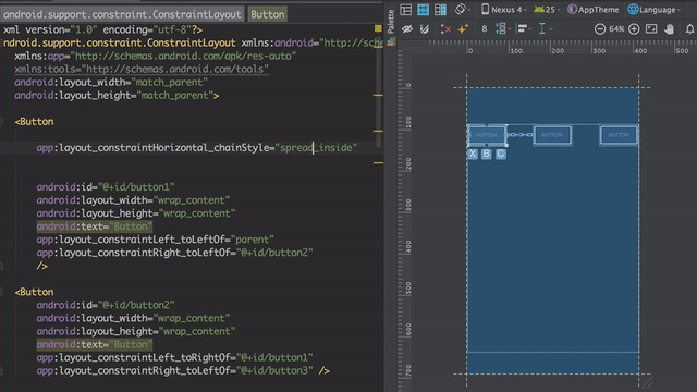 android:id="@+id/button2" ........ app:layout_constraintLeft_toRightOf="@+id/button1" app:layout_constraintRight_toLeftOf="@+id/button3" ........
