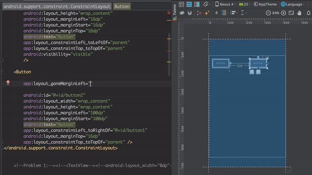 <?xml version="1.0" encoding="utf-8"?> <android.support.constraint.ConstraintLayout xmlns:android="http://schemas.android.com/apk/res/android" xmlns:app="http://schemas.android.com/apk/res-auto" xmlns:tools="http://schemas.android.com/tools" android:layout_width="match_parent" android:layout_height="match_parent"> <android.support.constraint.Guideline android:id="@+id/eightDpGuideLine" android:layout_width="0dp" android:layout_height="0dp" android:orientation="vertical" app:layout_constraintGuide_begin="8dp"/> <android.support.constraint.Guideline android:id="@+id/sixteenDpGuideLine" android:layout_width="0dp" android:layout_height="0dp" android:orientation="vertical" app:layout_constraintGuide_begin="16dp"/> <Button android:id="@+id/button3" android:layout_width="wrap_content" android:layout_height="wrap_content" android:layout_marginTop="38dp" android:text="Button" app:layout_constraintLeft_toLeftOf="@+id/sixteenDpGuideLine" app:layout_constraintTop_toTopOf="parent" /> <Button android:id="@+id/button4" android:layout_width="wrap_content" android:layout_height="wrap_content" android:layout_marginTop="99dp" android:text="Button" app:layout_constraintLeft_toLeftOf="@+id/eightDpGuideLine" app:layout_constraintTop_toTopOf="parent" /> <Button android:id="@+id/button5" android:layout_width="wrap_content" android:layout_height="wrap_content" android:layout_marginTop="75dp" android:text="Button" app:layout_constraintLeft_toLeftOf="@+id/sixteenDpGuideLine" app:layout_constraintTop_toBottomOf="@+id/button3" /> <TextView android:id="@+id/textView5" android:layout_width="wrap_content" android:layout_height="wrap_content" android:layout_marginTop="115dp" android:text="TextView" app:layout_constraintLeft_toLeftOf="@+id/eightDpGuideLine" app:layout_constraintTop_toBottomOf="@+id/button4" /> <ProgressBar android:id="@+id/progressBar" style="?android:attr/progressBarStyle" android:layout_width="wrap_content" android:layout_height="wrap_content" android:layout_marginTop="86dp" app:layout_constraintLeft_toLeftOf="@+id/sixteenDpGuideLine" app:layout_constraintTop_toBottomOf="@+id/button5" /> </android.support.constraint.ConstraintLayout>